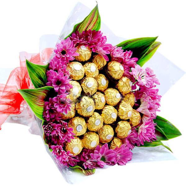 A delicious and fantastic gift of 25 ferrero rocher chocolates along with Chryshanthemums wrapped & tied with a bow